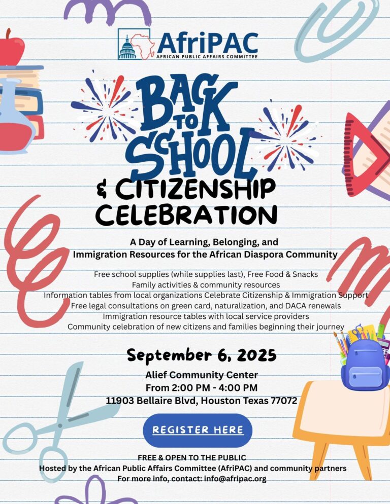 The African Public Affairs Committee (AfriPac) is committed to empowering our communities by expanding access to U.S. citizenship. This Naturalization & Citizenship Workshop will provide eligible permanent residents with the tools and support needed to navigate the naturalization process. In addition, a powerful panel discussion will highlight the experiences, challenges, and triumphs of Black immigrants—including African, Caribbean, and AfroLatinx communities—alongside African Americans in Houston, Texas .